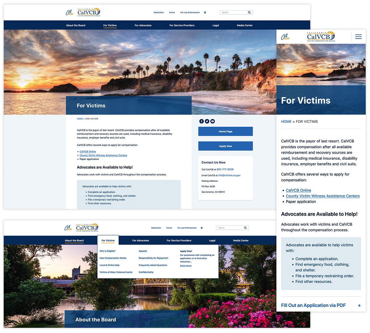 California Victim Compensation Board (CalVCB) oversees compensation to victims of violent crime and collection of restitution from criminal offenders. The state agency works to reduce the impact of crime on victims’ lives but its website was difficult to use, disorganized, and cluttered with old and non-essential content. It created friction and frustration rather than relief and confidence.