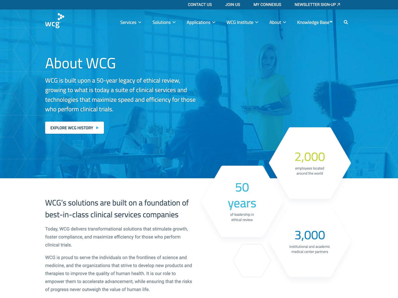 WCG’s clinical research services maximize the speed and cost-efficiency of clinical trials. For more than 50 years, WCG has guided organizations through the clinical trial process, from patient engagement and site selection to study planning, analytics, and reviews (ethical, scientific, and regulatory).